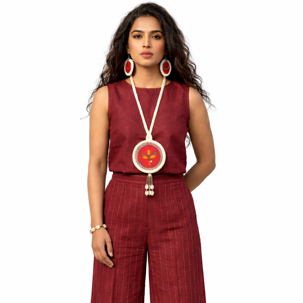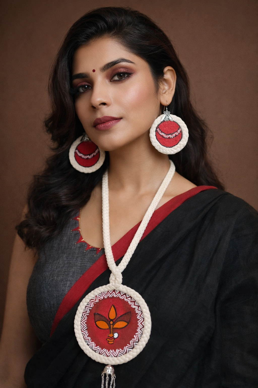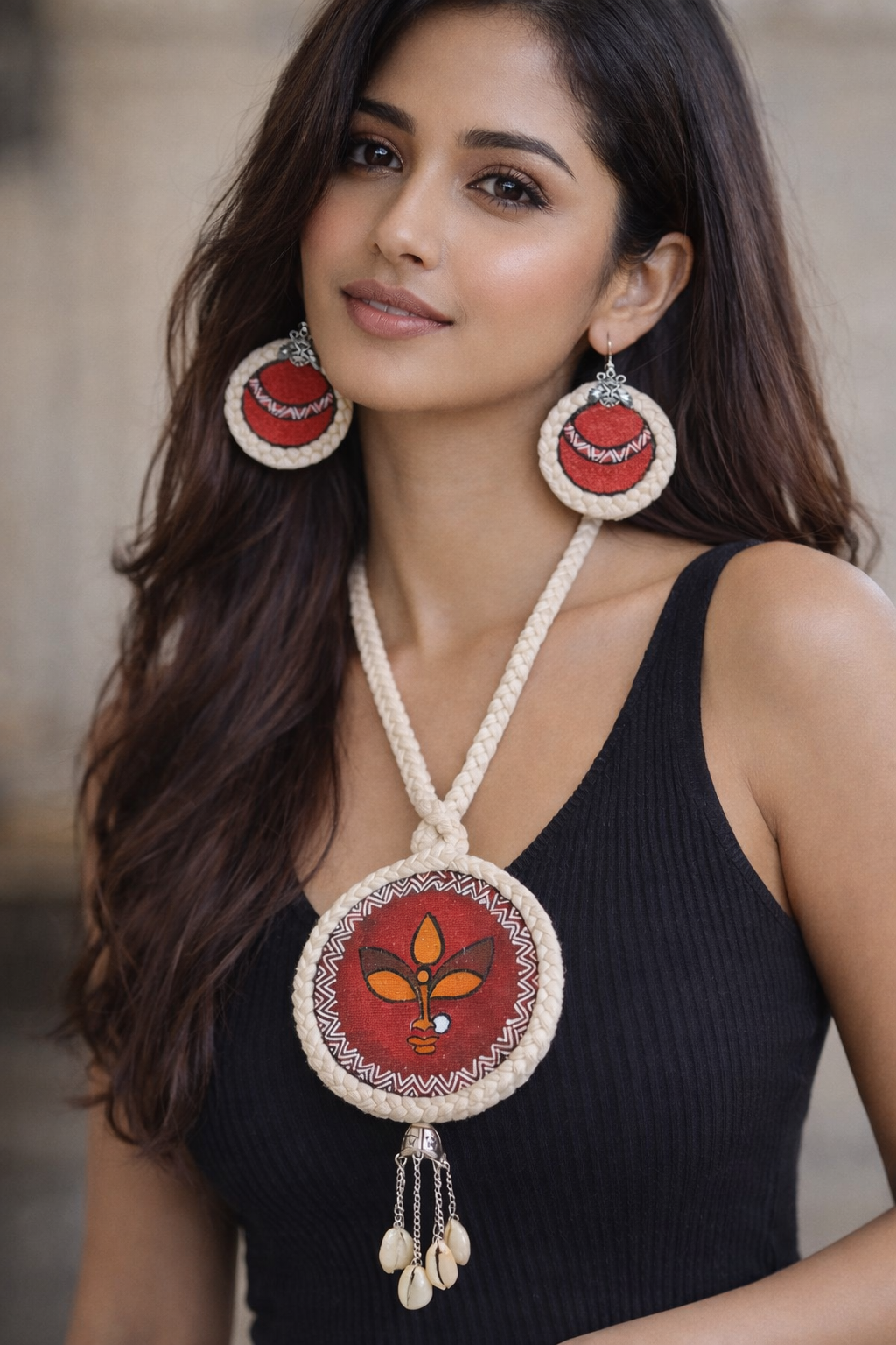 Ye ek unique handcrafted jewellery set hai jisme pendant canvas base par hand-painted artwork ke saath design kiya gaya hai 💛