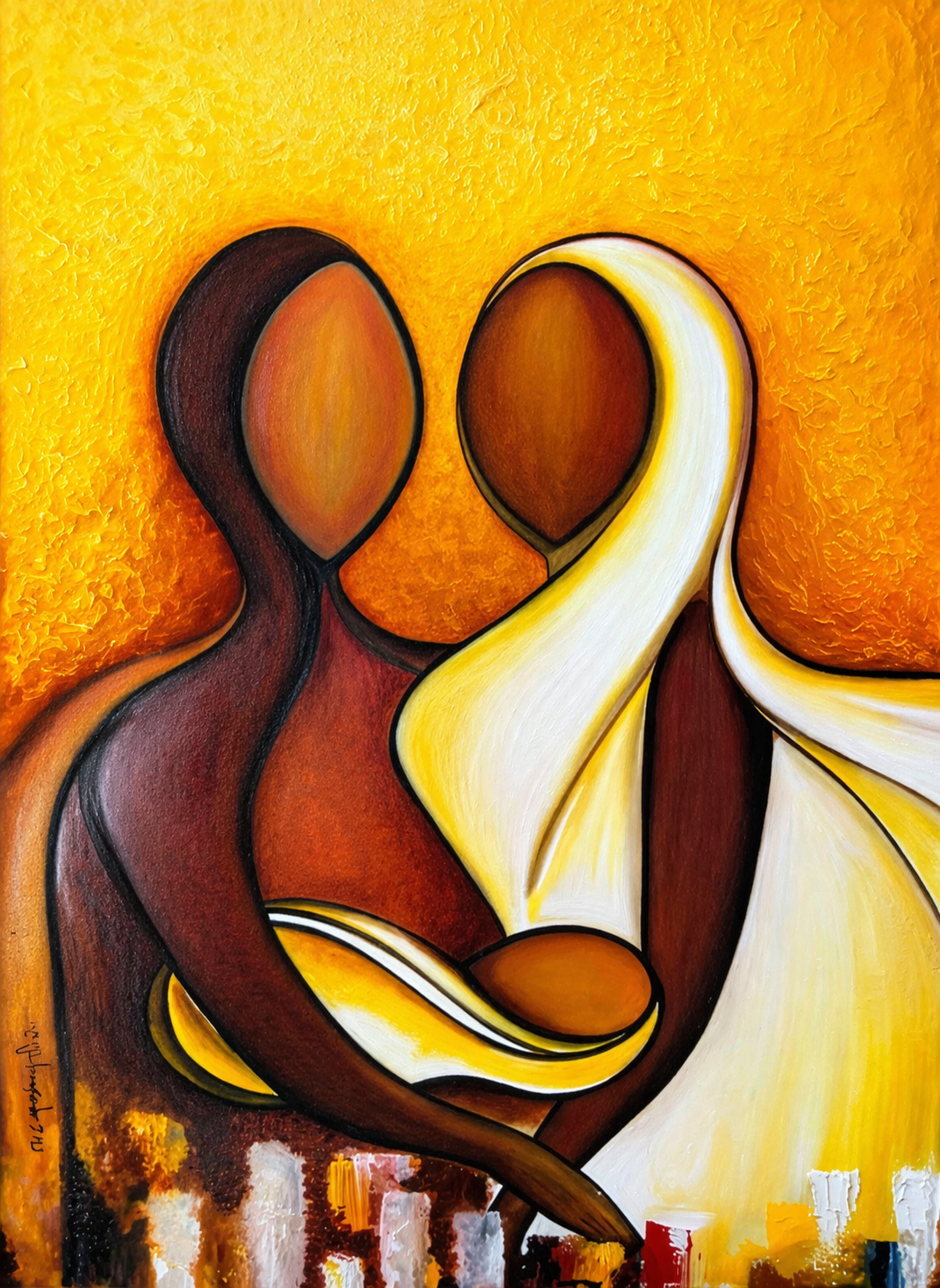 The artwork beautifully captures a minimal abstract family composition, symbolizing deep emotional connection, protection, and togetherness. The rich golden hues and earthy tones make it a perfect statement piece for luxury interiors.